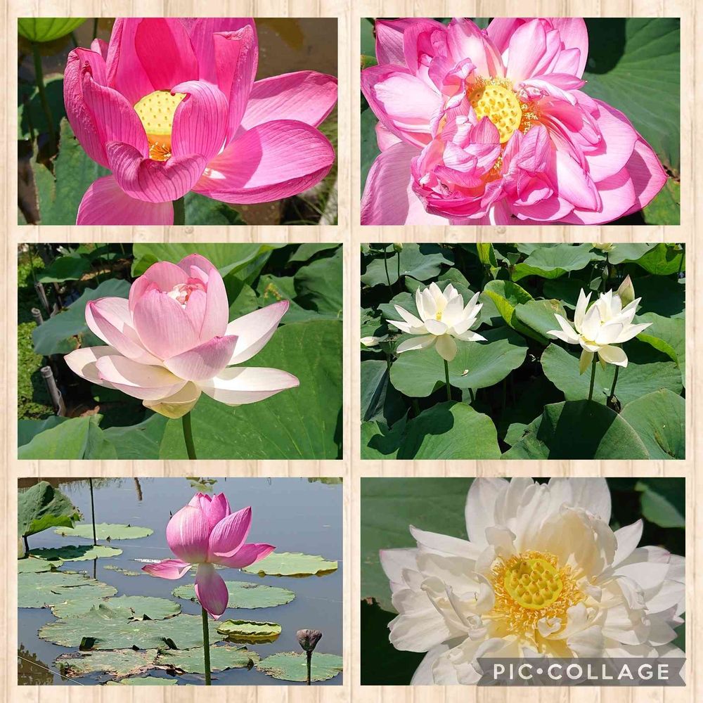 右上から、時計回りで、誠ハス、三色ハス、菊花粉、大紅袍ハス、王子ハス、巨椋の炎とありました🎵