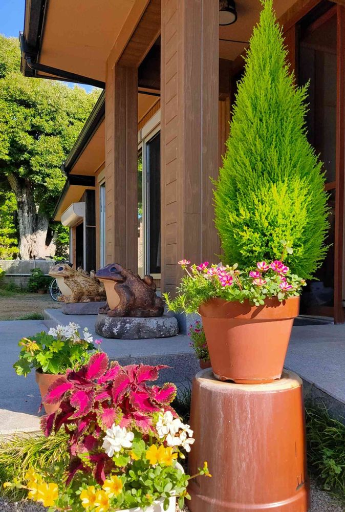 カエルさん 季節の寄せ植えがお迎えしてくれますね🌸🌼🌲🌳🌺