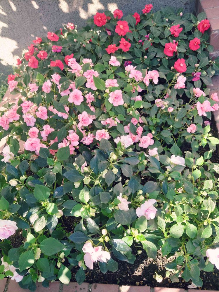 3色で植えた、バラ咲きインパチェンスカリフォルニアローズもボリューム出てきました💮