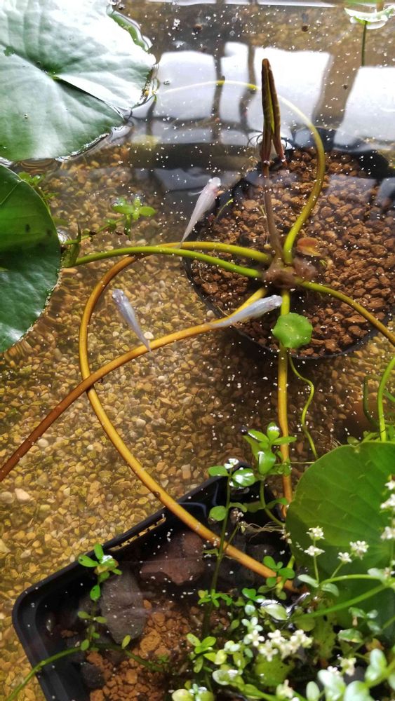 親めだかさんの泳いでいる近くの茶色い葉があがってきてる。睡蓮の葉っぱさん?暑い日が続いたので弱っていると思ってたのに…✴️がんばれ~🤭🤭