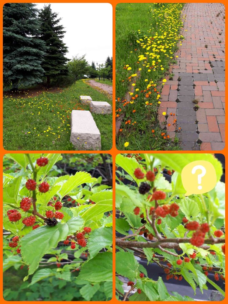 レンガ敷きの小道脇には、コウリンタンポポやキバナコウリンタンポポが続いてる💛🧡🌱💛🧡🌱