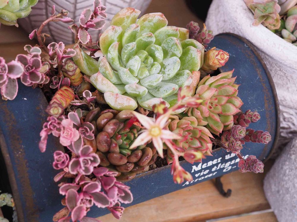 5月に寄せた多肉さんピンクルルビーが花を咲かせました、トリカラーも色が綺麗になってます🥰