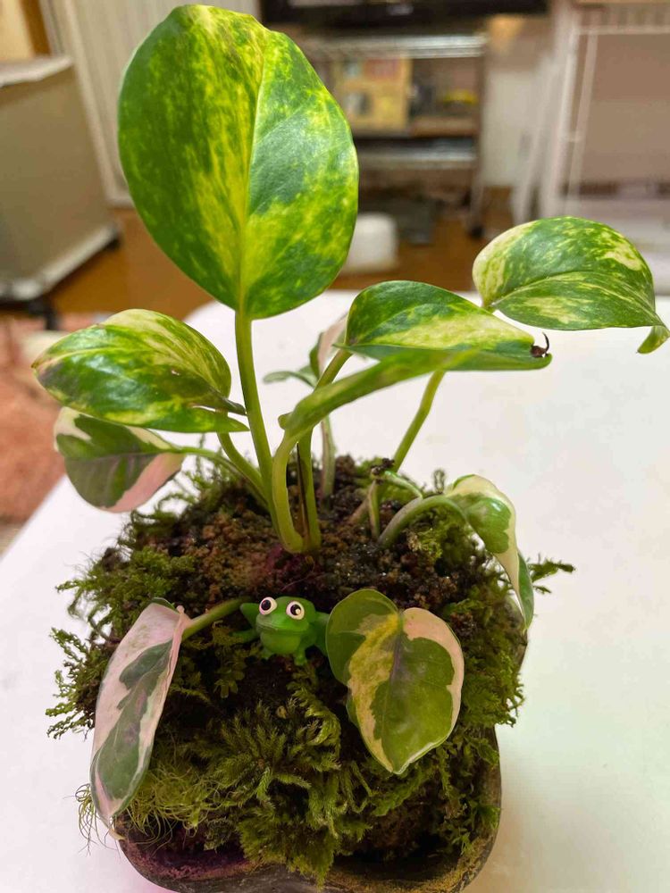苔玉、元々植えてあった植物が水分が多いと根腐れしやすい種類だったから植え替えしたら、穴のあいた苔玉だけが残って、それがずっとあって💦 でも、まん丸の苔玉って私的には好みでなく、周りにコケリウム用の苔を植え、上部にはポトスゴールデンとエンジョイを植えて🐸をチョコン💓 これでかわゆす~(*'▽'*)♪