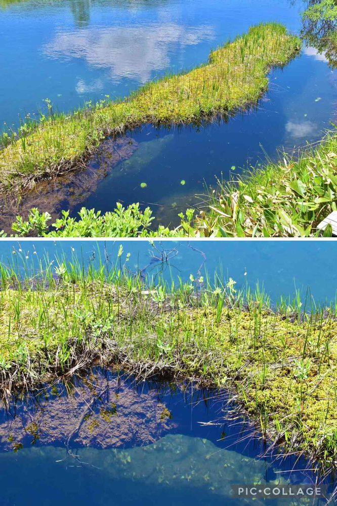 大きめの池塘に、浮き島が浮かんでいました♪ 堆積物の固まりが水に浮かんで背中に草を生やしてます。底を抜けて池塘の底が透けていますね😆