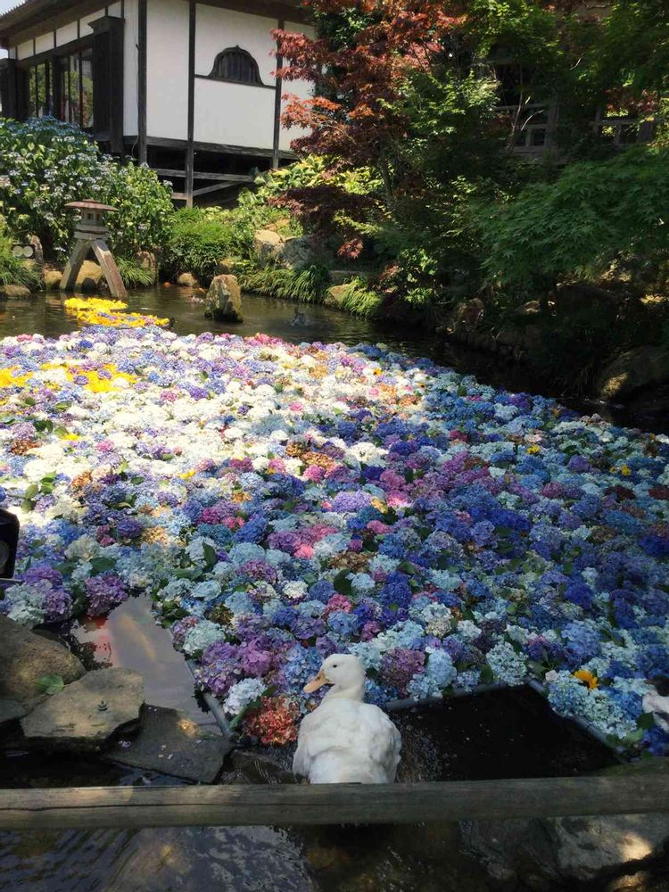 池に浮かぶ紫陽花の絨毯?の上を、アヒルや鴨さんがヨチヨチと沈まないように歩いて遊んでいて、可愛かったです🦆🦢
