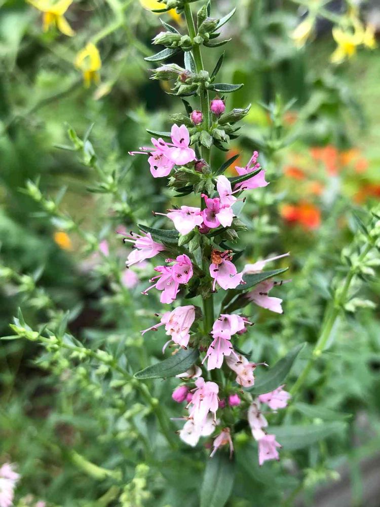 ポタジェの中のヒソップの花が穂の下から咲き始めました😄