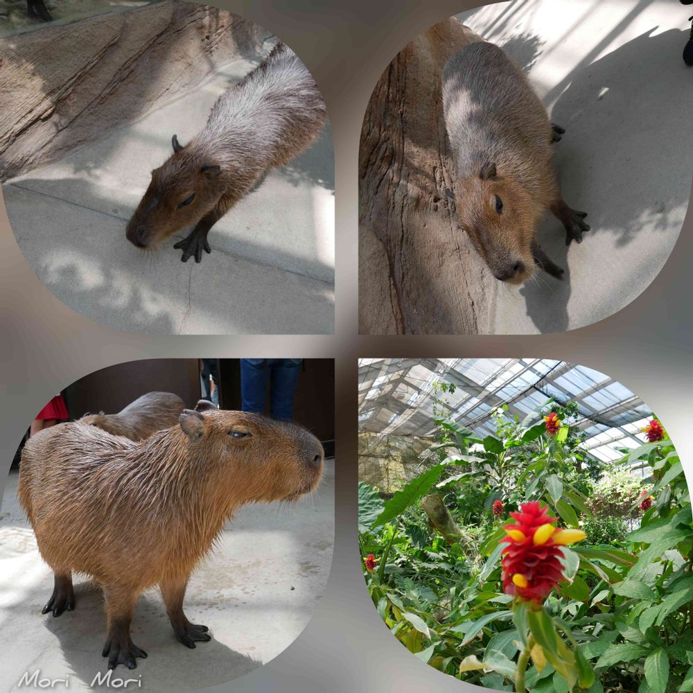 神戸どうぶつ王国では熱帯の森や湿地等エリア別に2重のドアで仕切られていますが、このエリアに入った途端、前方から数頭のカピバラがかけてきて、仕切りのドアを人が開けた時を狙い脱走しました😅(上の2枚)