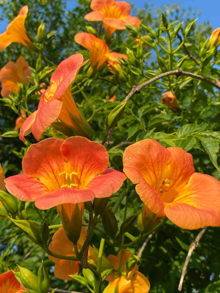 散歩の途中、真夏の象徴のようにノビノビ伸びたいだけ上に向かい、下に垂れ下がりたいだけ垂れ下がるオレンジ色のお花。