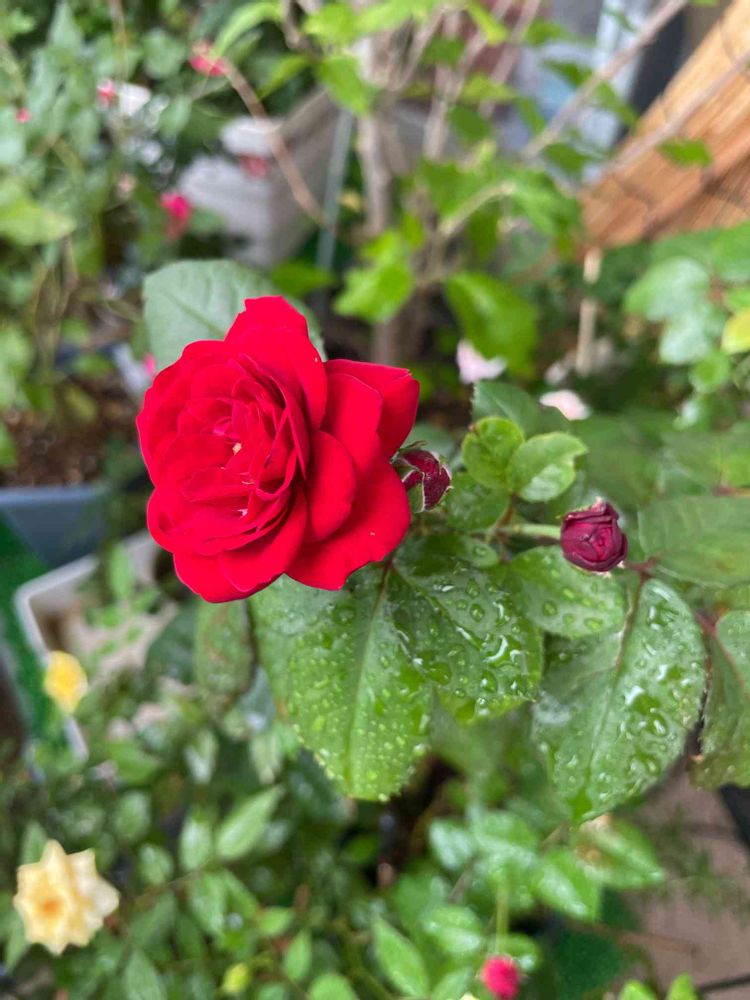 7/4 深紅のバラ「いっちょう」(鉢の名前)の2番花が咲きました。この暑い中、すごいです。