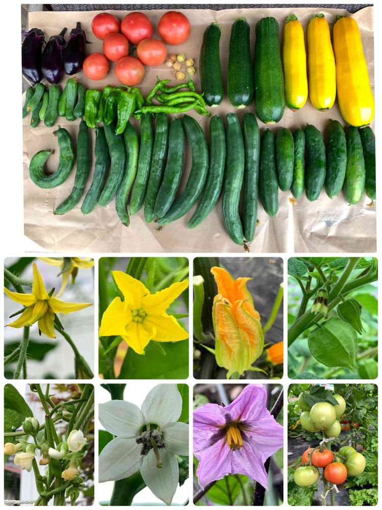 左上から右に、トマトの花・きゅうりの花・ズッキーニの花・食用ほおずきの花