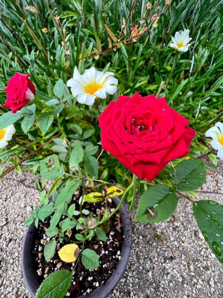夏は苦手な庭と主なので、色々植えてないので、鉢植えの赤いミニ薔薇さんで明るくなりました🌹🌹