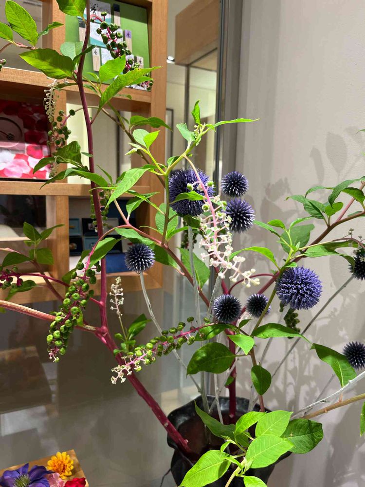 このヨウシュヤマゴボウ、私の実家の方ではほぼ雑草状態で空き地などに生えてますが、こんな風にルリダマアザミと生けたら、なんてステキなんでしょう🥰