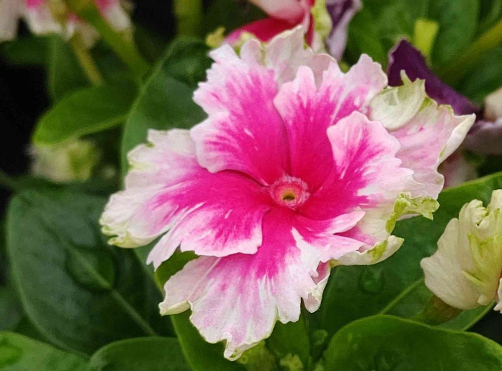 花弁の中央からビビットピンクが刷毛で塗った様に広がり、先端に向け白い縁取りとフリンジ❇️目を惹く鮮やかなお花ですね🤗