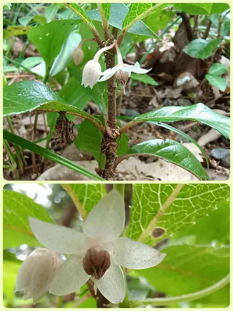 お花は下向き、色は地味、森は暗い、葉っぱに隠れて見つけにくいですね。