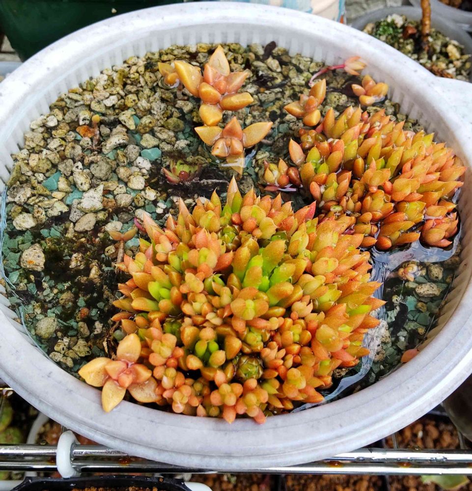 今さらですが、この爪蓮華とか葉挿しその他もろもろが押し込まれているものは、白いプラ鉢ではなくて、プラ製のボウルとセットになった百均の白いザルです🥣