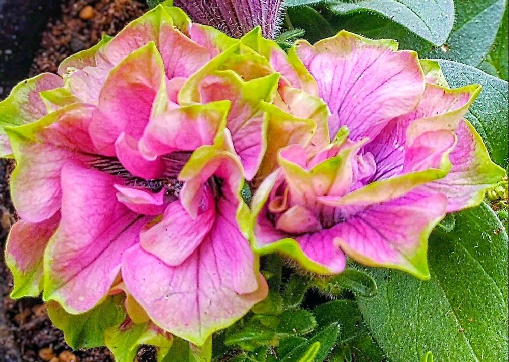 こんばんは。黄色い緑の縁取りがあるピンク色のペチュニアは初めて拝見しました。アクセントが効いてとても素敵ですね。