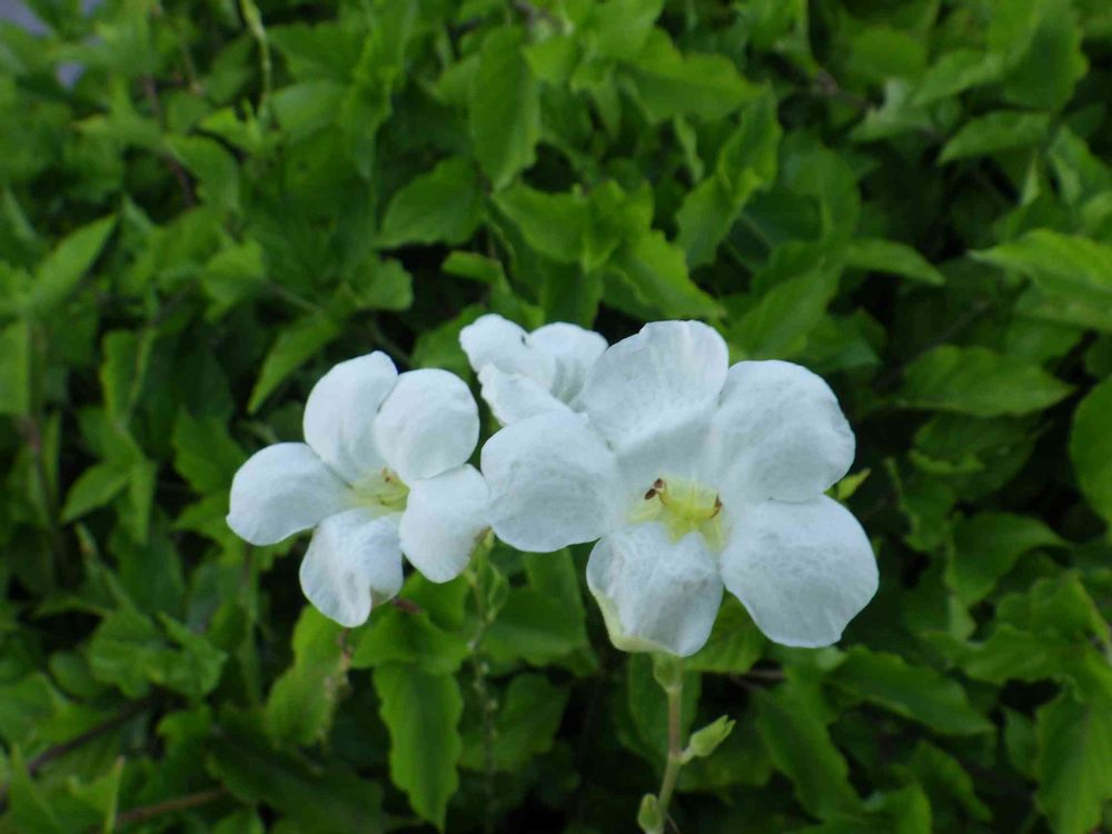 花色は青紫色や青色のものが多いが、稀に白色のものも。白色のコダチヤハズカズラの花も中心は少し黄色