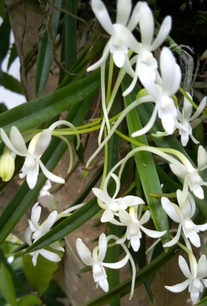 自生してたフウランを枝ごともらつてきて(50センチほど)我が家のキンモクセイの木に針金でつるしてウン十年 今年が一番たくさんのお花が…👀✨🥰👏👏👏