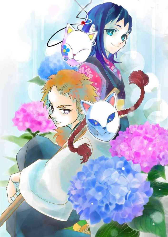 梅雨明けちゃいましたが、紫陽花と水の呼吸使う錆兎と真菰を一緒に。