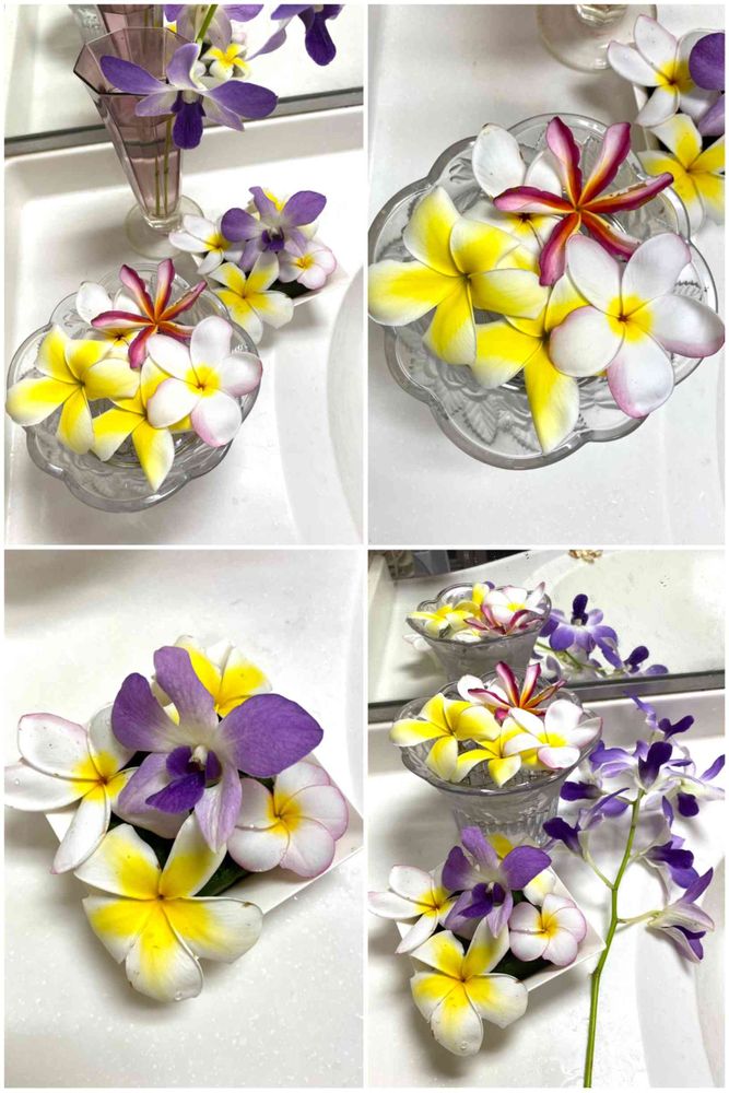 綺麗✨✨ 南国のホテルのバスルームみたいですね。私もプルメリアが道に落ちてたら、持ち帰ってお水に浮かべて楽しみます❤️ プルメリアはほんとに良い香りがしますね😍