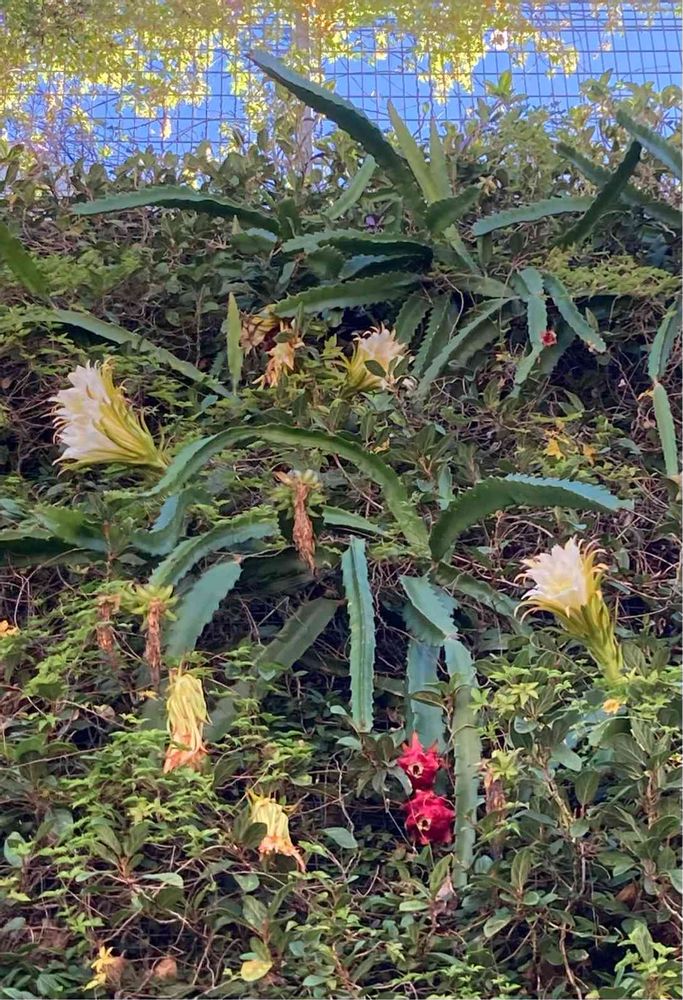 今日は朝イチで診察とリハビリで病院でした。朝早かったお陰で昨夜咲いたドラゴンフルーツのお花がまだ咲いてました😊 7/1に投稿した天高く育ってるドラゴンフルーツ群です🐉