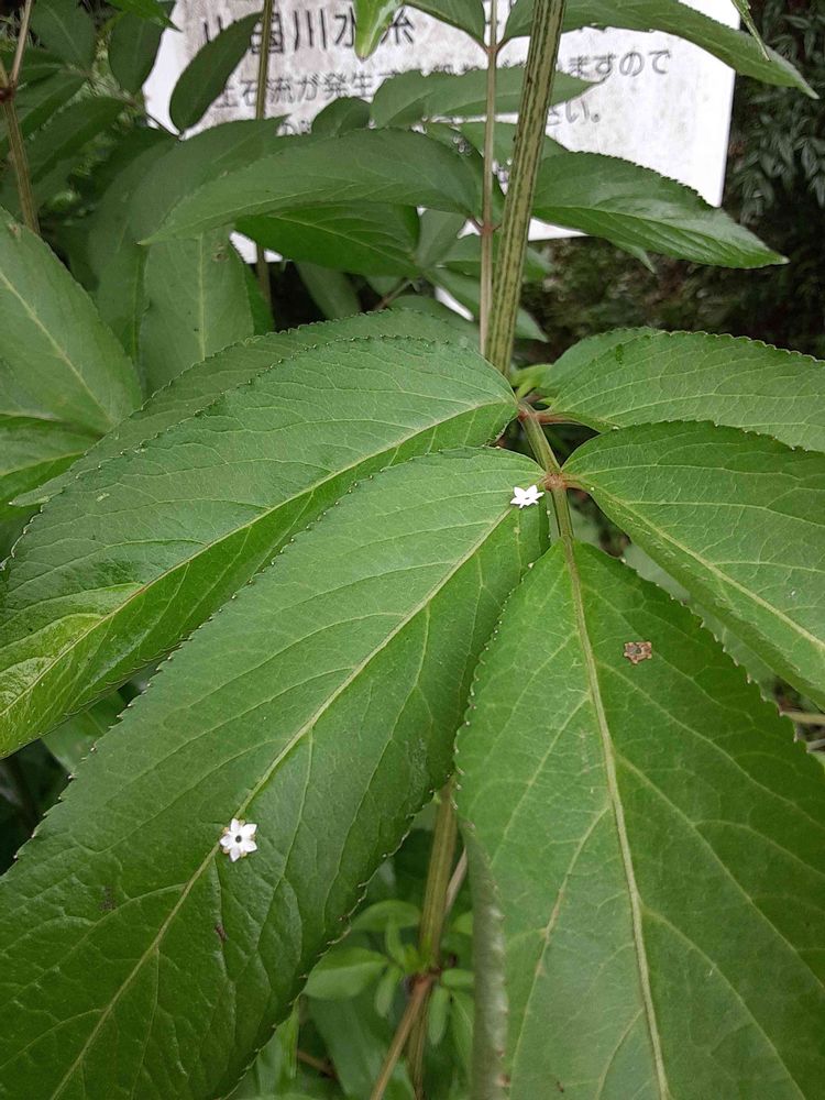 これが先程投稿した花の葉っぱ部分です。ヤツデでもヤブミョウガでもないですね?昨年の自分のpicで名前がわかりました。