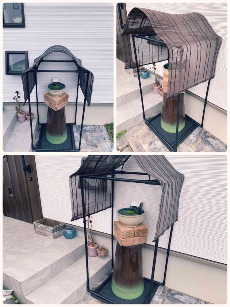 塩ビパイプを使い、組み立て、そこから園芸用のアーチを活用して天井に、すだれ掛け、最後はシックに塗装を施し完成です😊