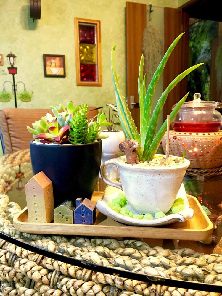 ダイニングキッチンでのカフェスタイル。手元の多肉を眺め眺めながらの一服。