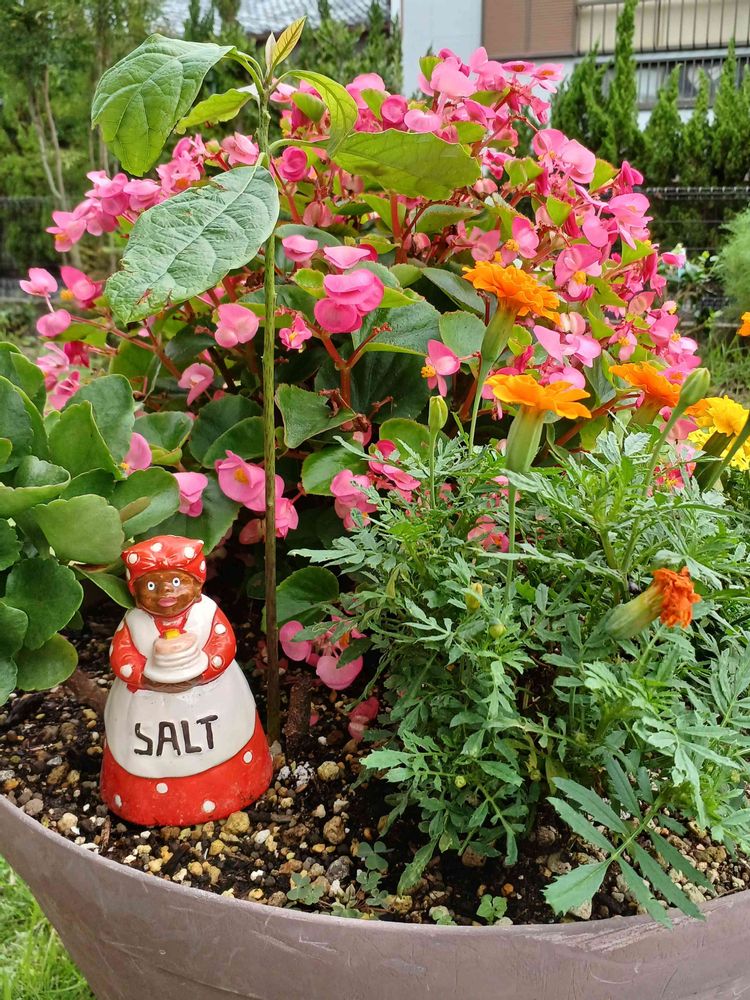 なんか可愛いから玄関の寄せ植えに加えた陶器のお人形。