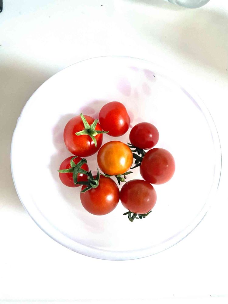 初めまして!ミニトマトいっぱい~☺️今年はあまりならなかったです😅お皿が素敵 てずくりには見えないです