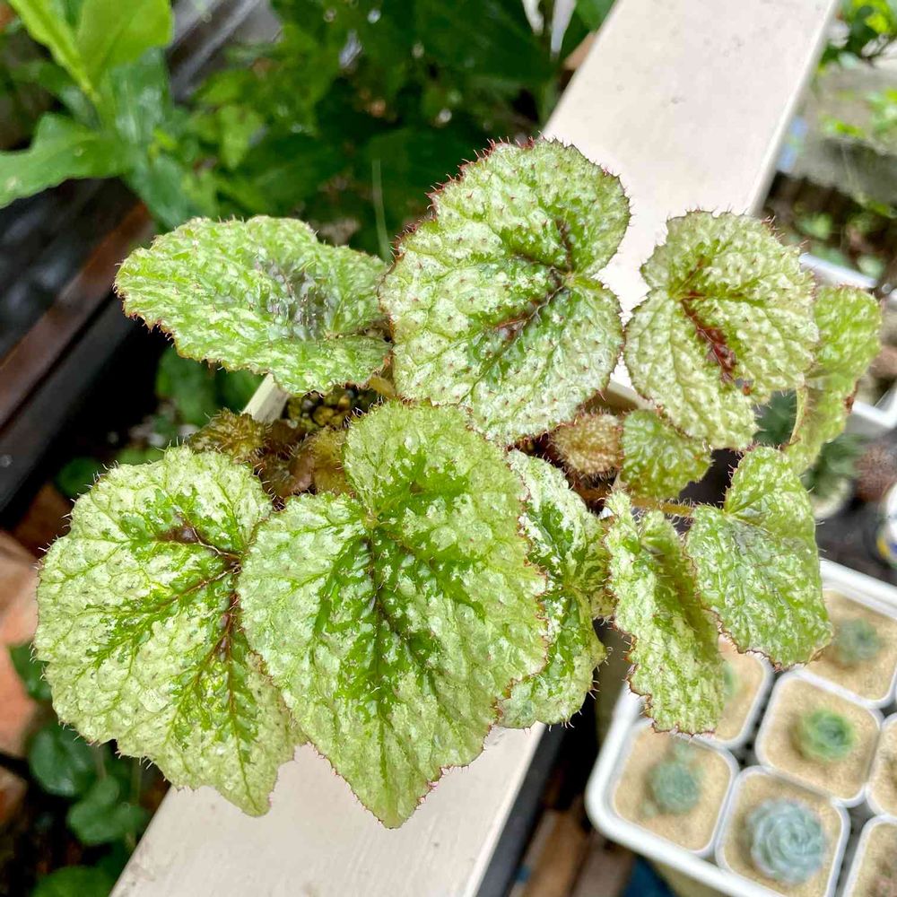 小さな葉っぱが赤い毛で覆われていますね。うちのアイアンクロスもマソニアのシルバーリーフなんだ!とguchaさんのpicで確認取れました。ありがとうございます😊ベゴニアの名は本当わからない💦