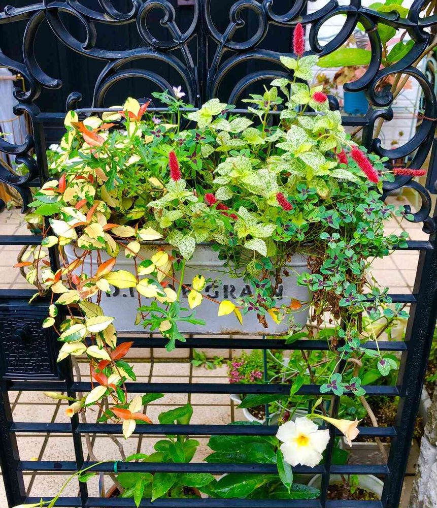 グリーンの寄植えの中で、キャットテールの赤が可愛いです💕