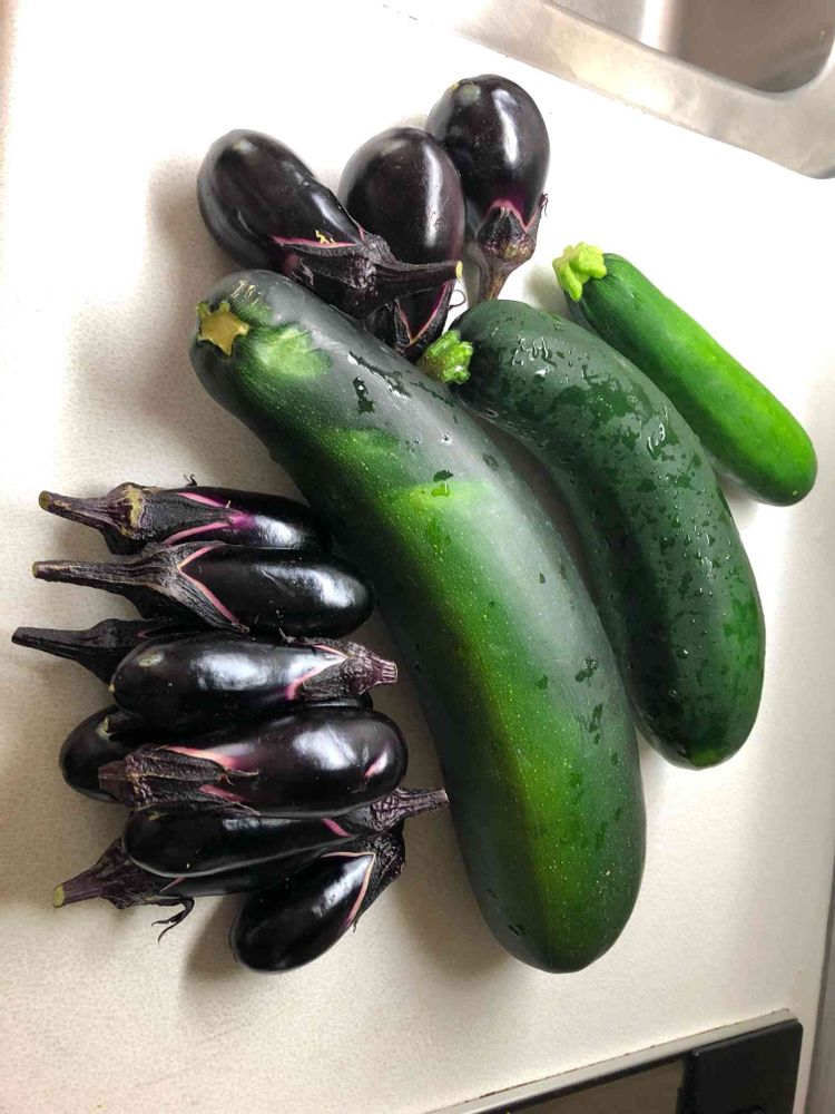 🎶 今朝の収穫ナス・巨大ズッキーニ ♫