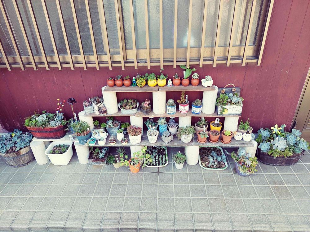 多肉棚は、置くものや数に寄って変更可能で、ダイソー板は、ニス塗っただけで、台風の時はすぐに片づけられるので便利です。