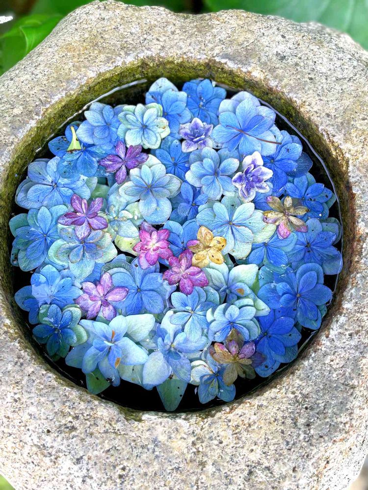 何度か投稿したあじさいが、花手水に生まれ変わってくれていました😊