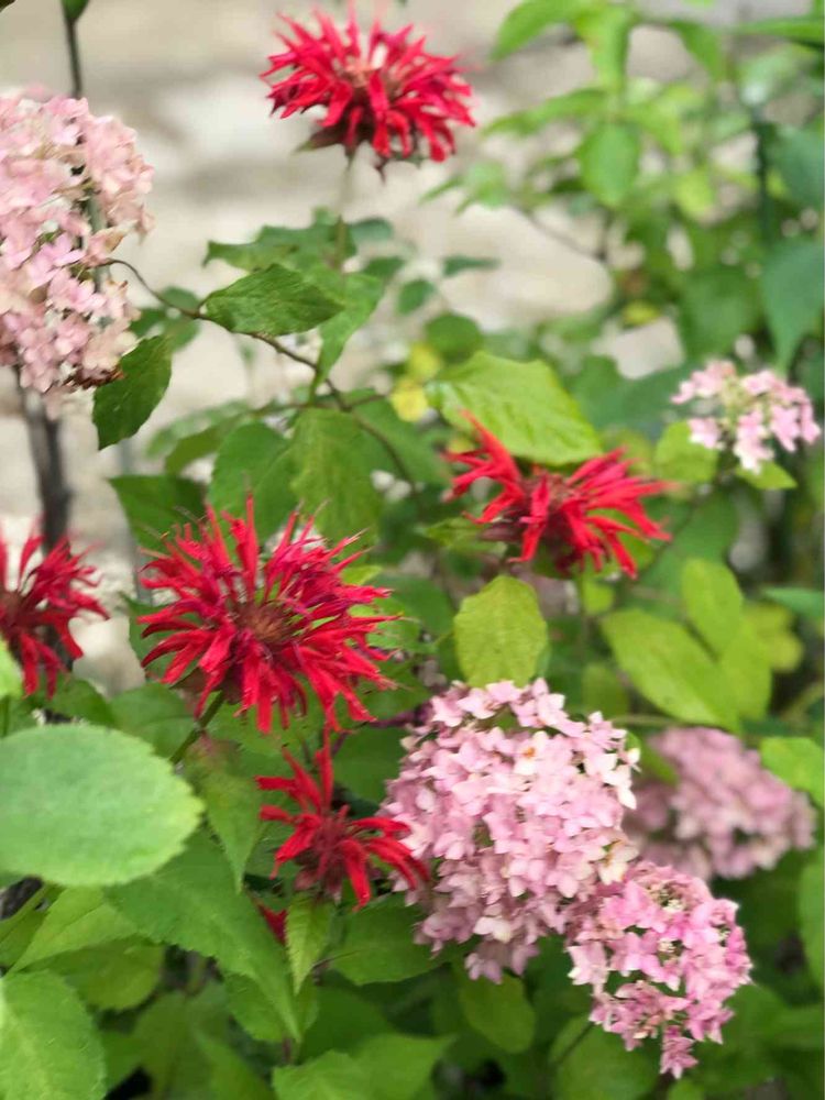 ピンクのアナベルに赤のモナルダがとっても合いますね🥰