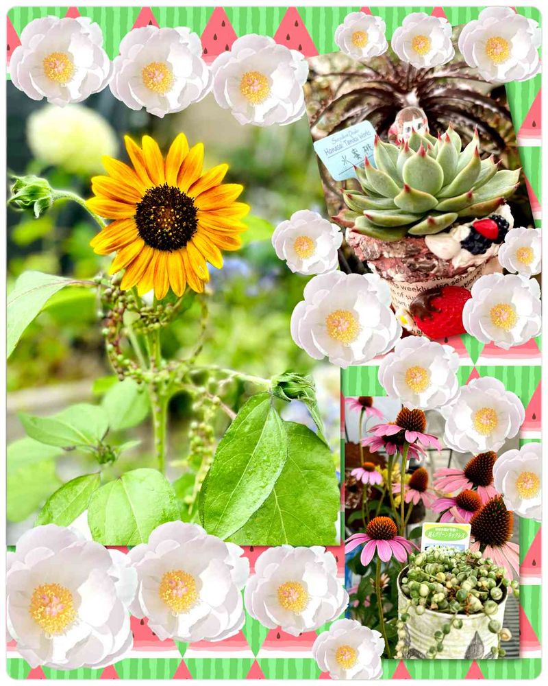 ⬅️こぼれ種の向日葵🌻さんに、根元の怪しいグリネを✂️して、オシャレしてみました🤣