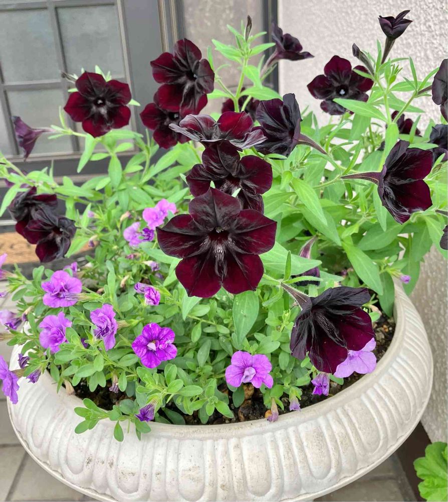 ペチュニアの黒い花びらが、ベルベットのような艶があります。😊
