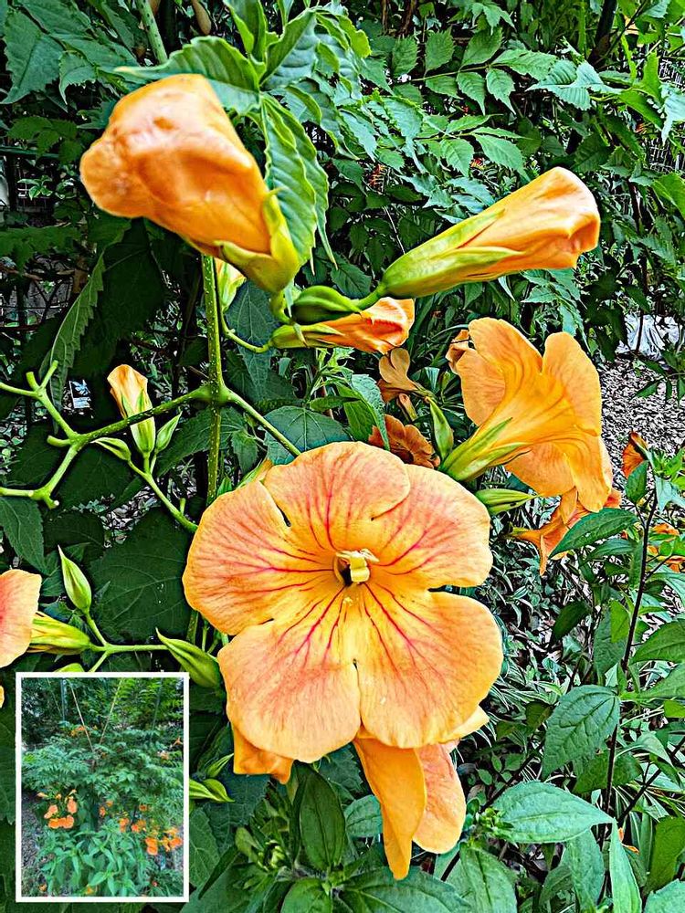 カタバミさんのお出かけ先,ノウゼンカズラ(凌霄花),/美しく次々と咲く黄橙花、一輪一輪はなぜか短命という/の投稿画像