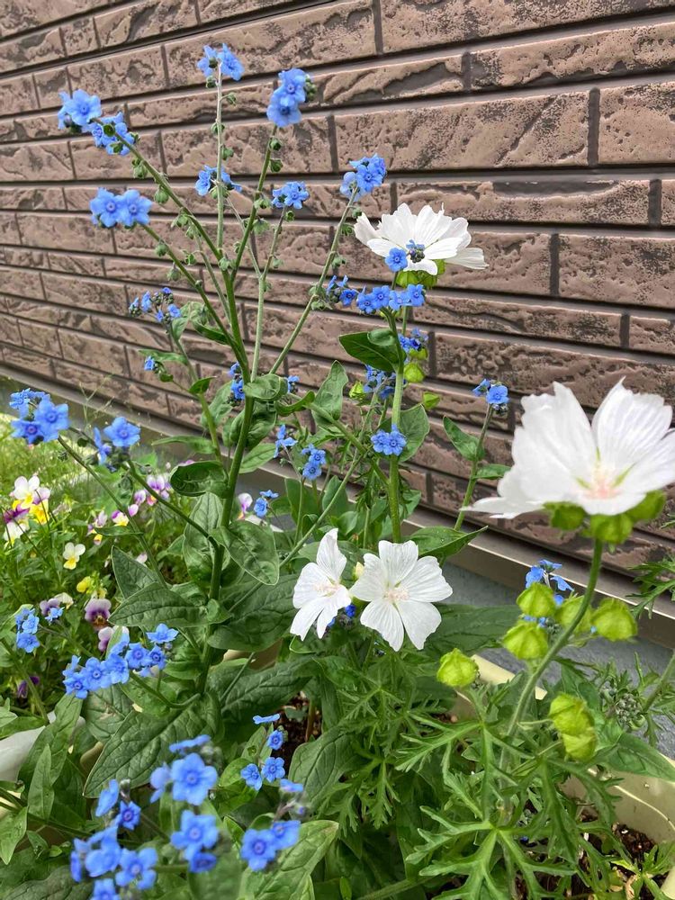 その空きスペースに植えた白いムスクマロウとのコラボ💙🤍