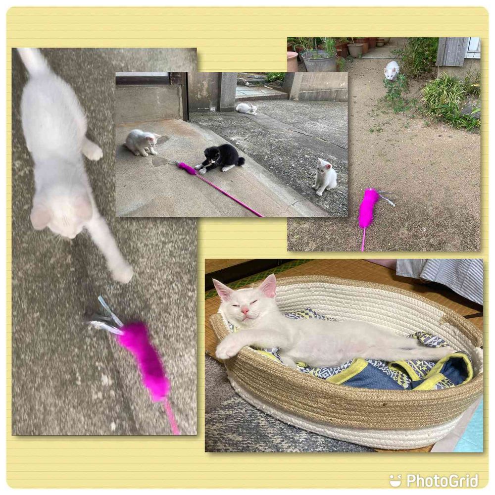 ロング猫じゃらしを手に持っているとついて来るようになったシロちゃんチルドレンズ🐈