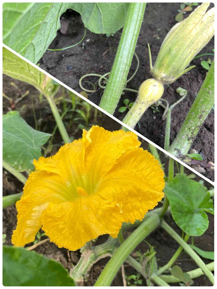 朝☀️畑に出たらバターナッツカボチャの花が咲いていました🎶下は雄花で上は雌花ですね😅多分(✪‿✪)