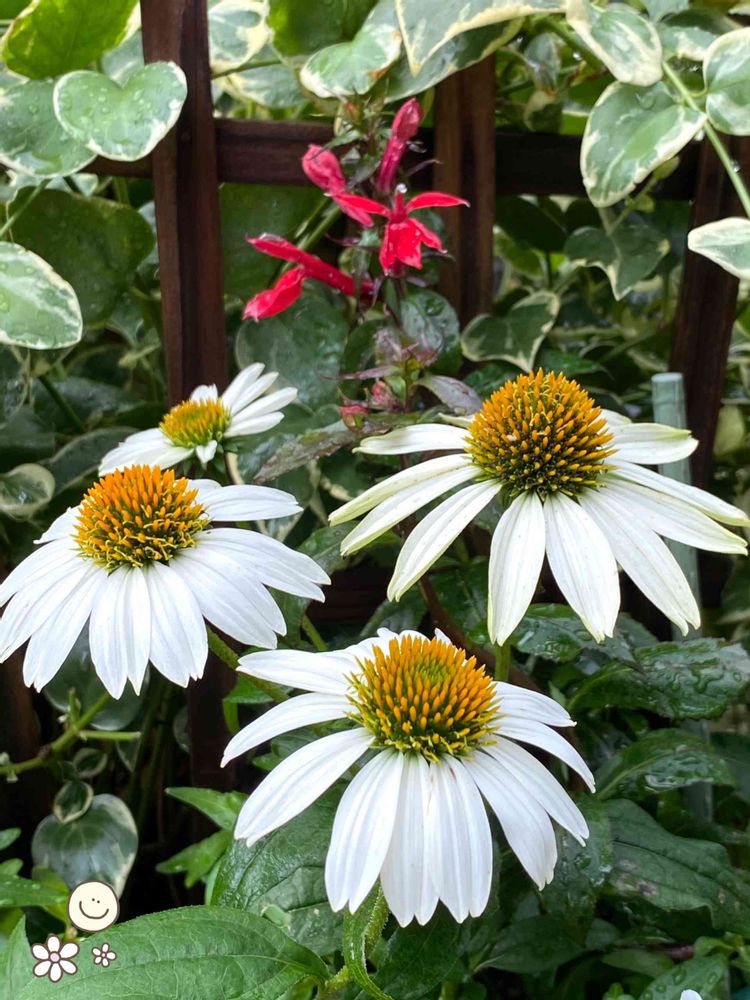 エキナセア白の向こうに赤い花と、グリーン。とっても素敵ですヽ(^。^)ノ
