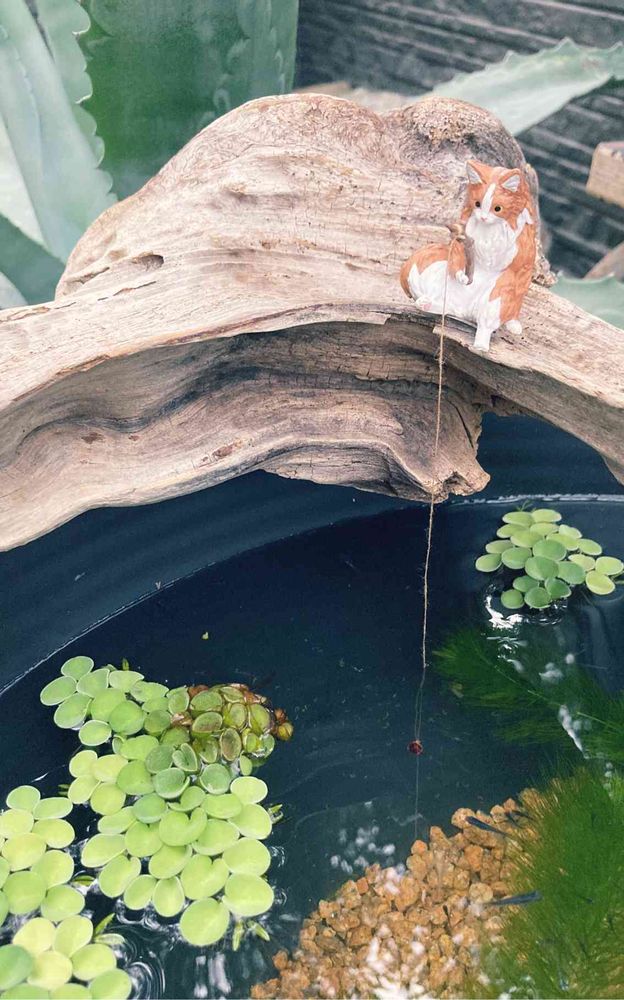 美しいメダカ鉢ですね。にゃんちゃんが釣りをしているのでしょうか?