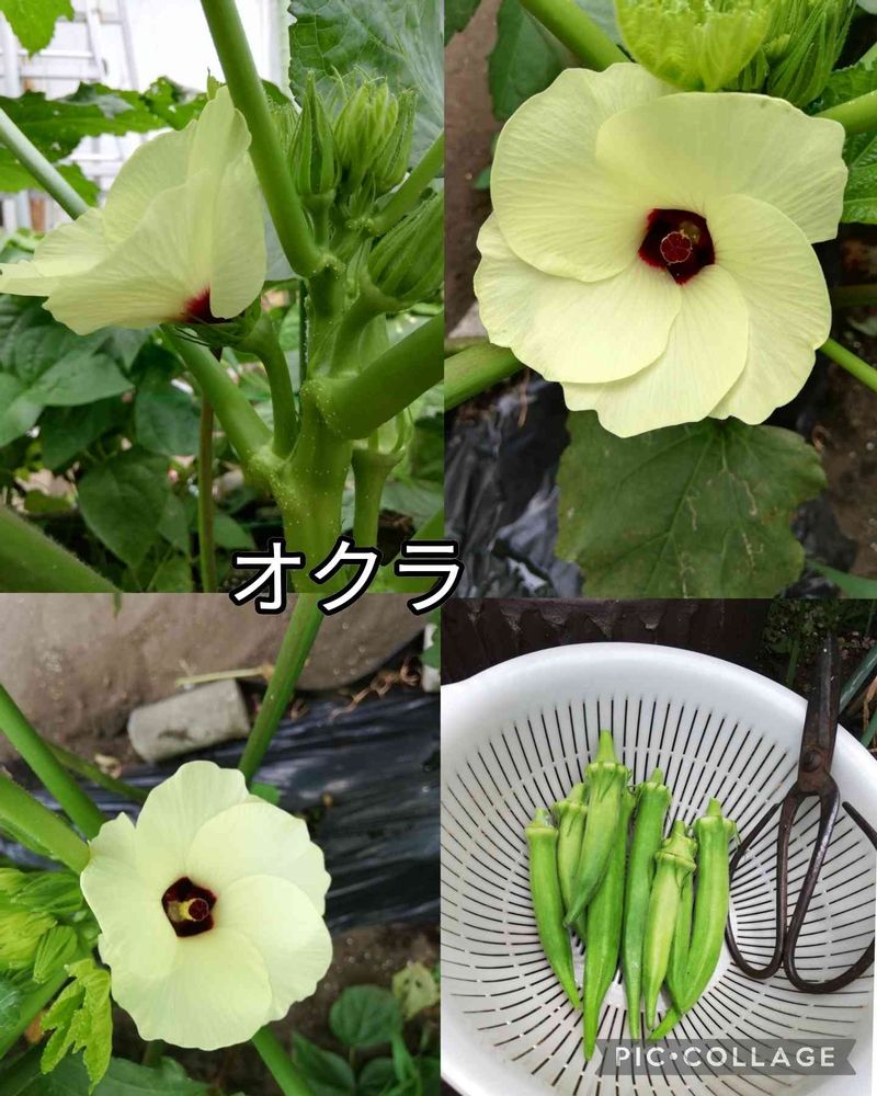 オクラの花と収穫です オクラの花初めて見ました ムクゲとよく似てる😲