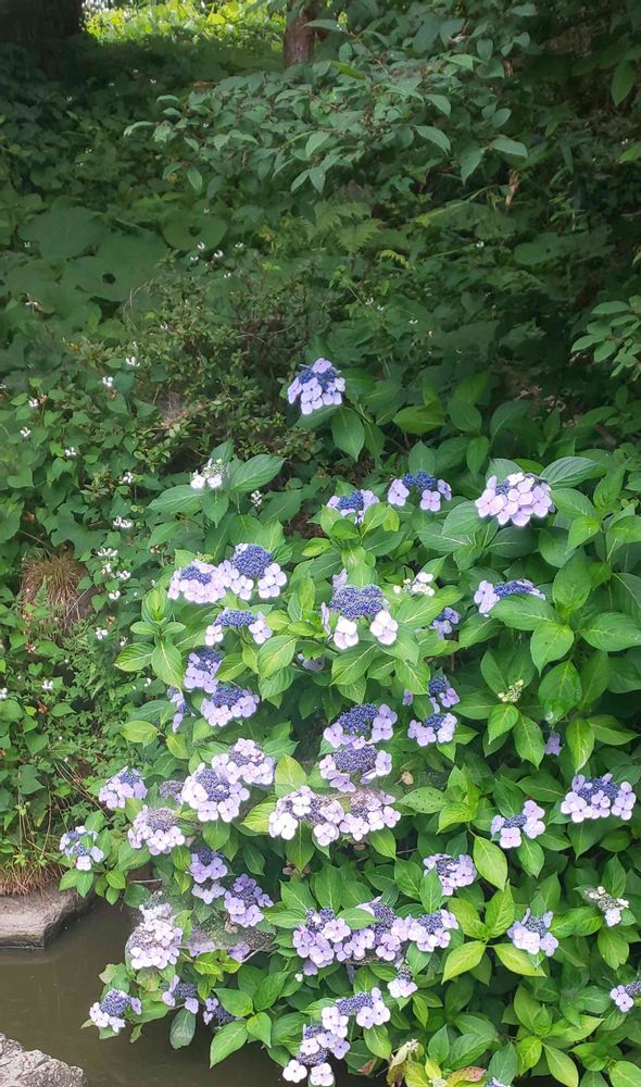 池向こうのガクアジサイ(レンズ検索) 隣は徒長したどくだみ👋😁