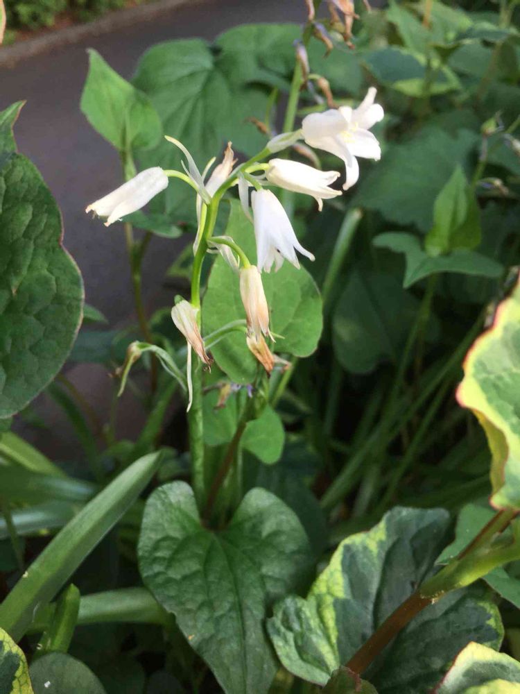 名前を教えてに回答いただきありがとうございます。葉っぱはドクダミみたいですね。花はシラーカンパニュラータみたいです。この前見たピンクのものより小さく時期が遅くベルの形がイマイチですね。別の花に見えました。