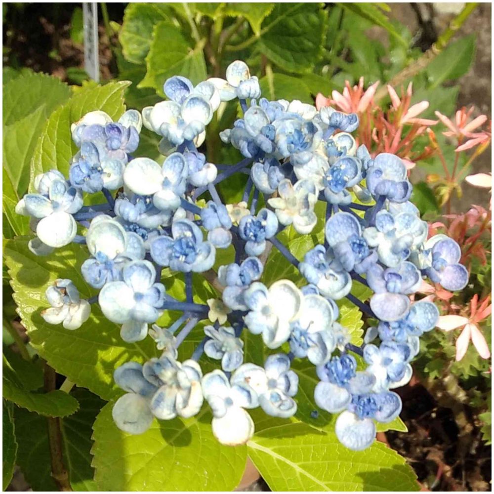 鉢植え最後のお多福ブルー、もう一つ咲いてますが離れ過ぎ😆