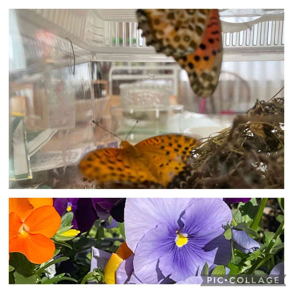 「ツマグロヒョウモン」うちのビオラをいっぱい食べて、サナギになり、羽化しました。2匹。