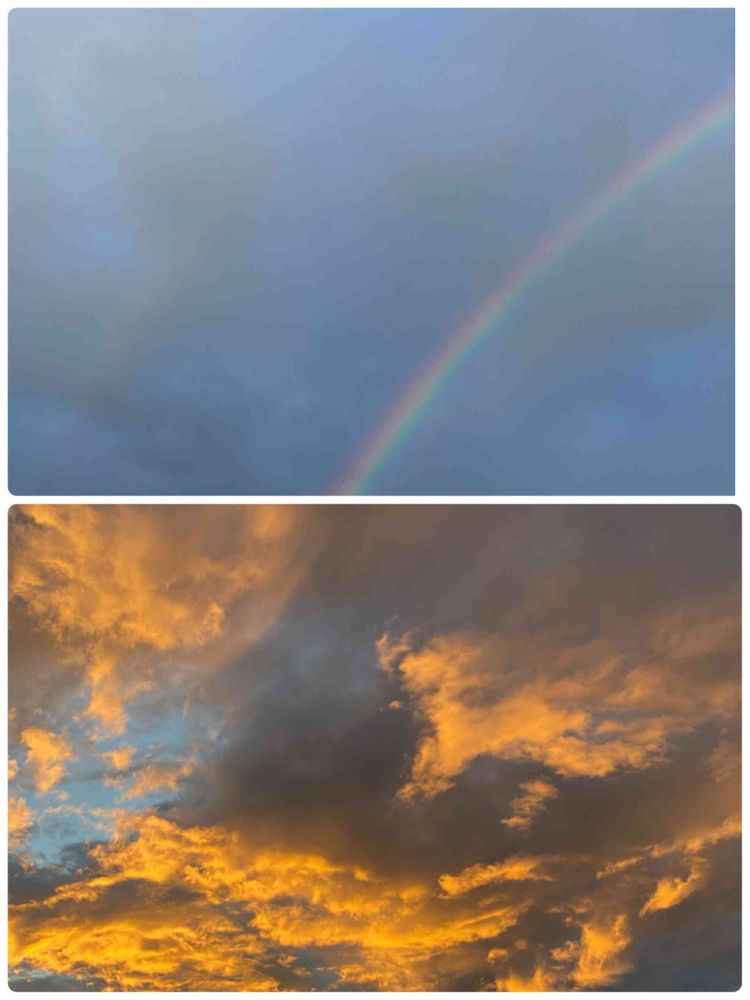 今日の夕方です。ダブルの虹が出たかと思ったら反対側の空は黄金の夕焼けでした。